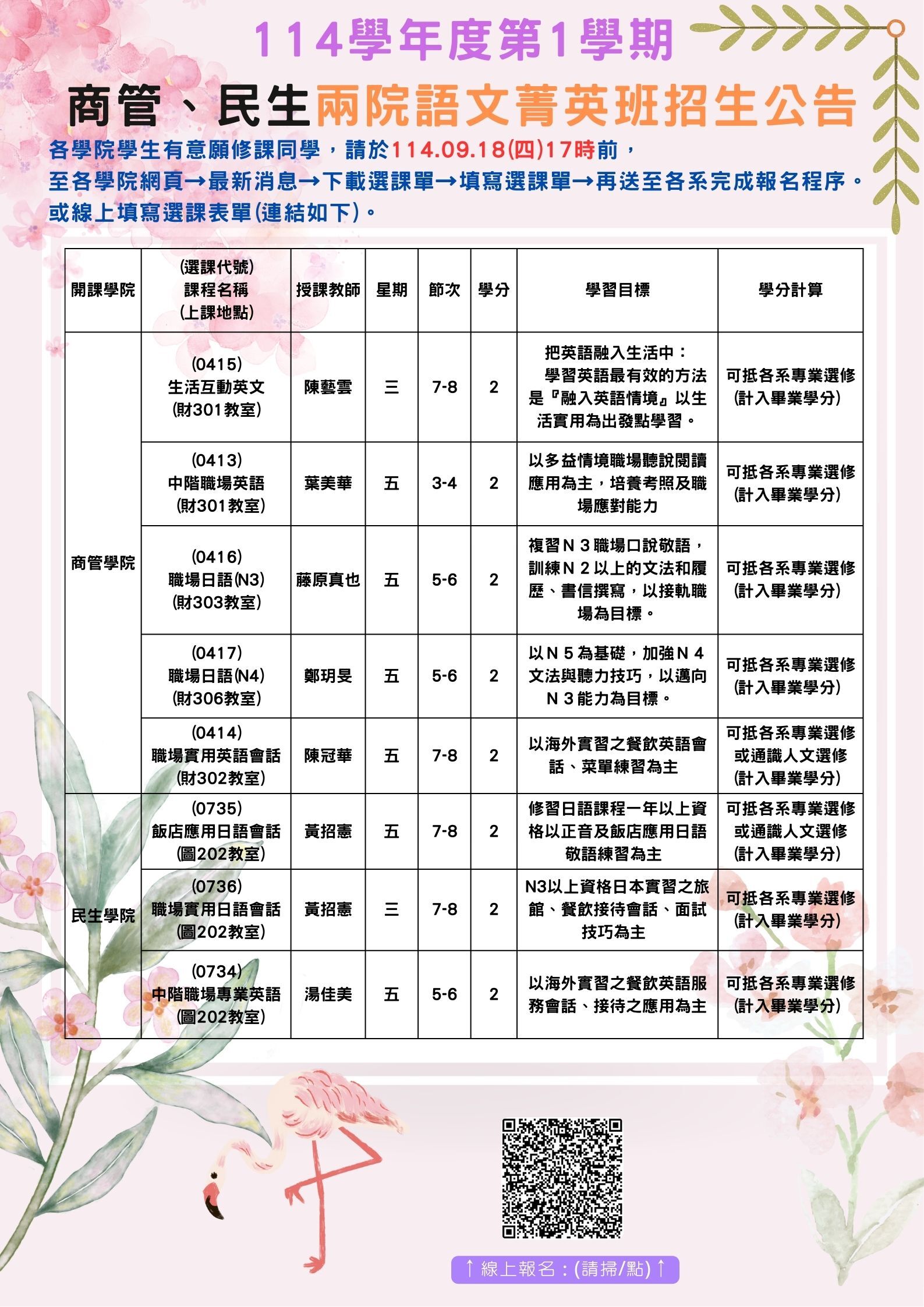 114.1學院院訂選修課程選課事宜(含課程選課資訊)
