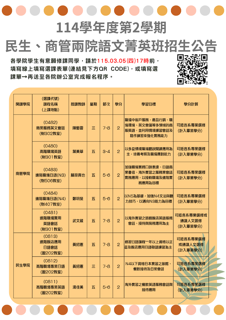 114學年度第2學期民生、商管兩院語文菁英課程 公告